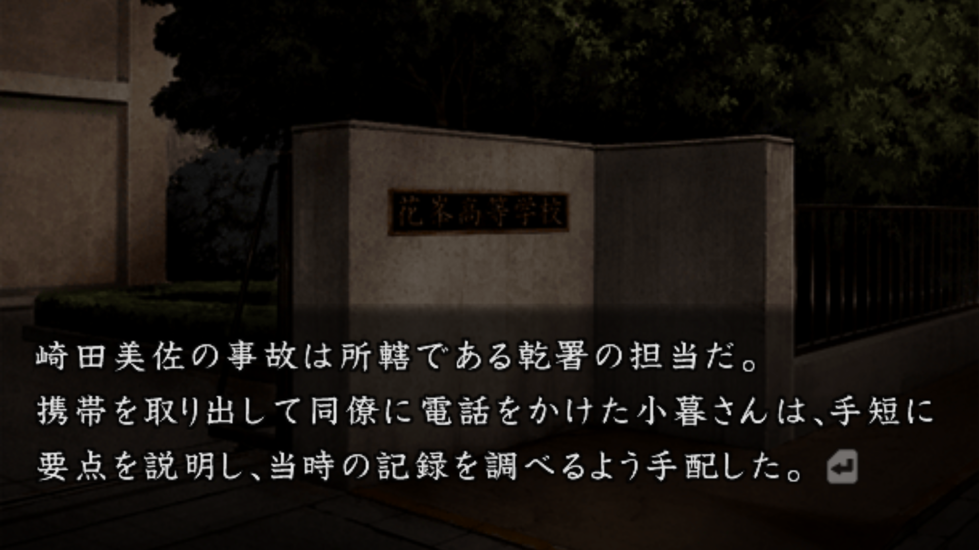 The Inui Police Department had jurisdiction over the case of Misa Sakita's accident. Mr. Kogure took out his cell phone, called his colleague, briefly explained the gist of the incident, and arranged to have the records from that time examined.